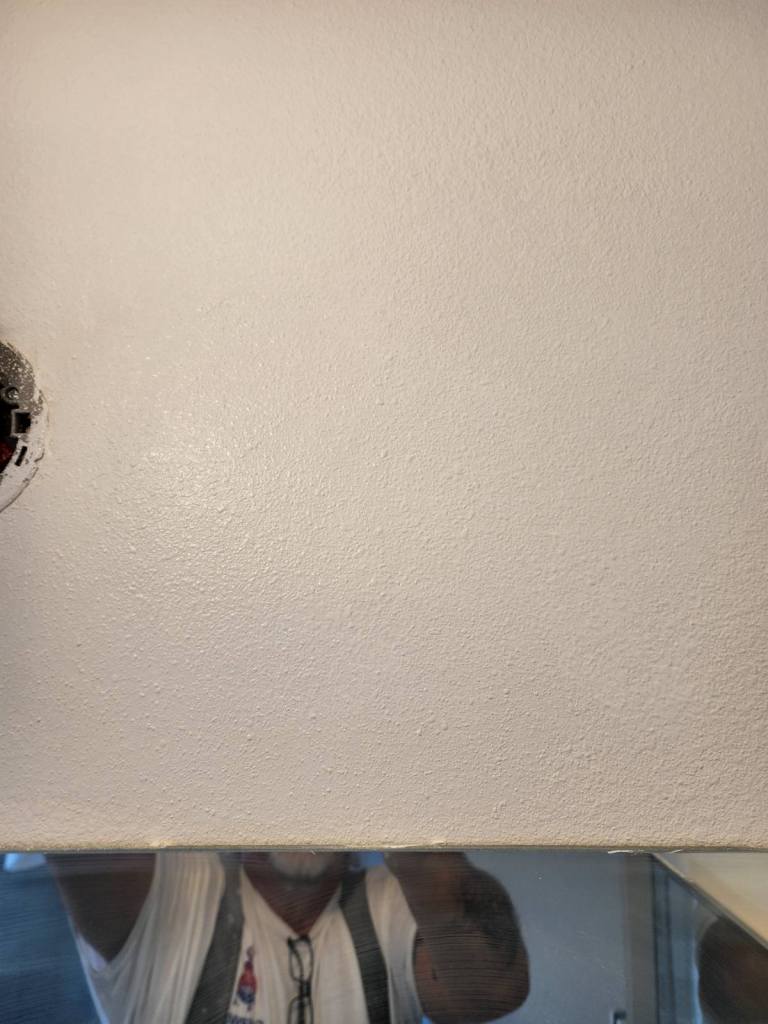 Before and after photos of a custom living room ceiling showcase our straight lines in our decorative painting jobs. Quality painting is our specialty!